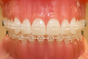 単結晶サファイアを使用したセラミック製ブラケットで、宝石のような輝きと透明感を持っており、ホワイトワイヤーとの組み合わせで表側からの矯正器具としては最も目立ちにくいものとなっております。 |