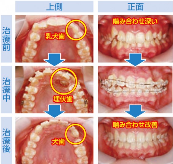 過蓋咬合を治すべく、矯正治療を開始しましたが、もう一つ問題がありました。患者様の上顎左側の犬歯が、乳犬歯(子どもの歯)の状態でした。レントゲンで確認すると、大人の犬歯は歯茎の中に埋まった埋伏歯の状態であったため、乳犬歯を抜去して、犬歯を引っ張ってきました。そして、2年の歳月をかけて、過蓋咬合を治しました。