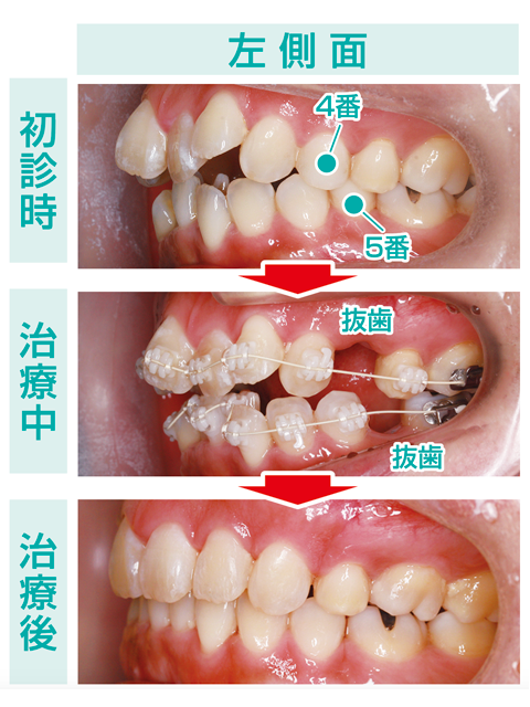 通常は凸凹を解消するため、上下左右の4番目の歯を抜歯するのですが、それだと下の前歯が下がりすぎて、出っ歯が治らず、噛み合わせが不安定になると判断したため、下は5番目を抜歯しました。